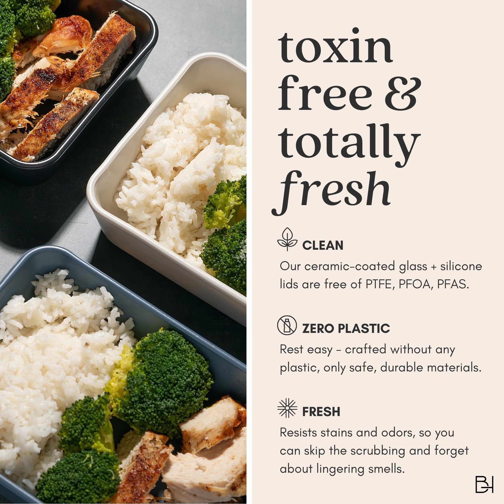 SAFE, NON-TOXIC CONTAINERS! Every piece of our food containers are free of toxic materials such as PTFE, PFOA, PFAS, and BPA. Brivara ceramic coated glass meal prep containers are healthier for you and your food.
