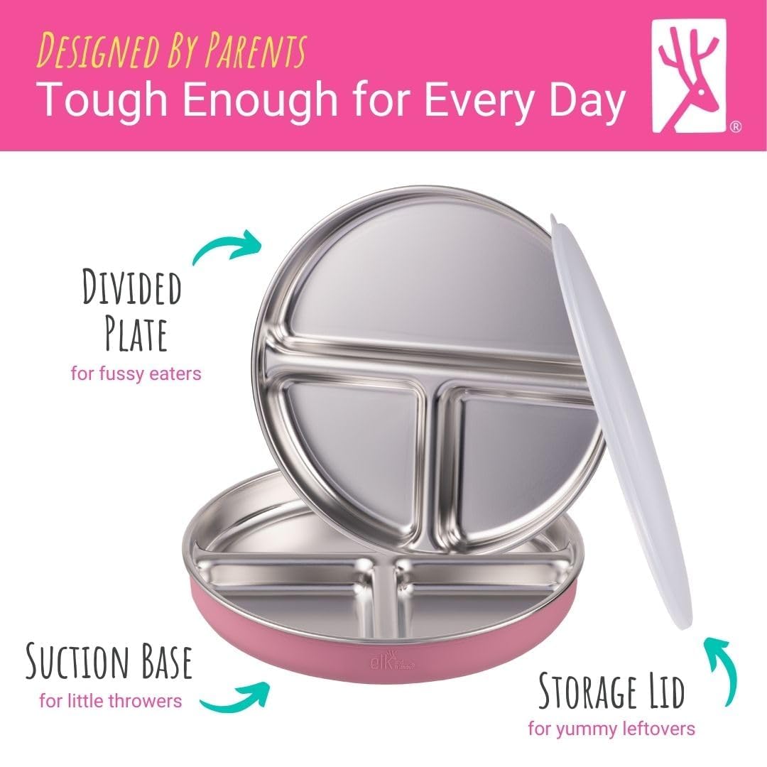 Elk and Friends Stainless Steel Divided Plates with Silicone Sleeve for Babies & Toddlers | Lids Included | Stay Put Suction | Dinner & Snack Plates | 4 Pack
