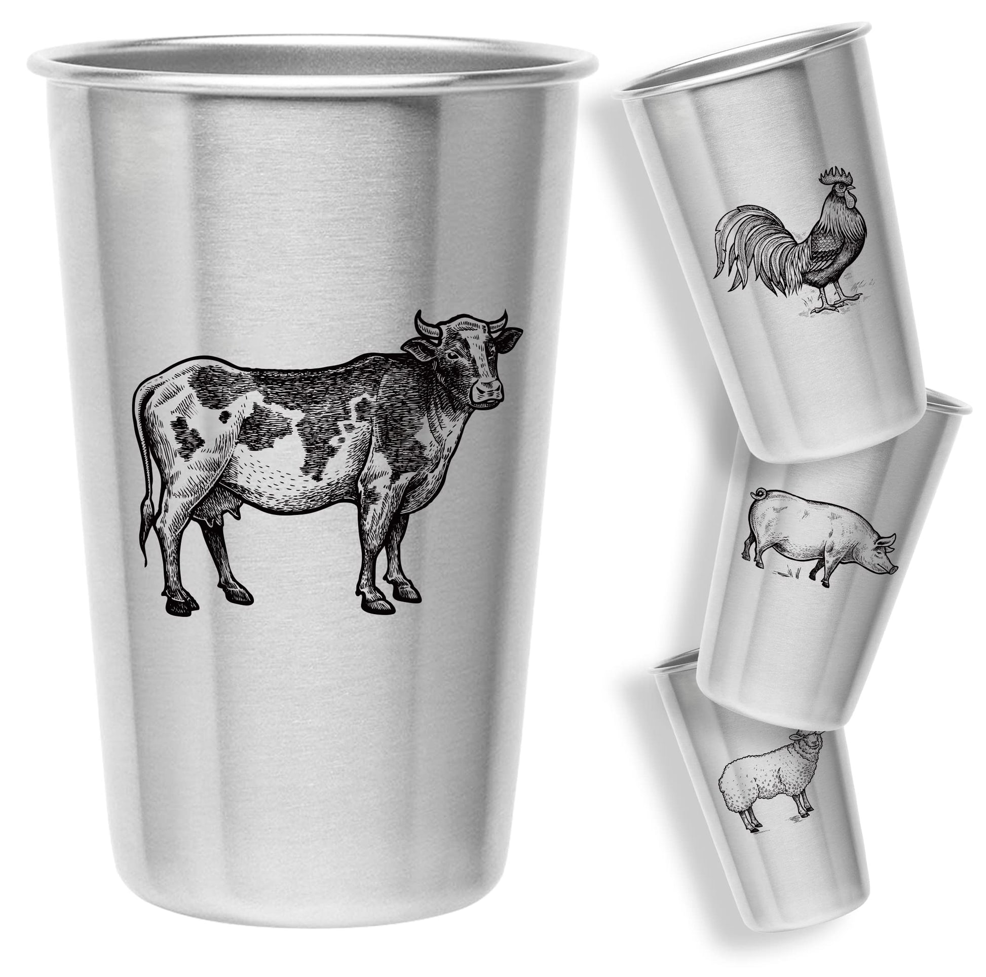 Sip sustainably with our Stainless Steel Pint Glass Set, crafted from high-quality, food-grade stainless steel for long-lasting use. Each 16-ounce tumbler features unique animal graphics—a cow, pig, sheep, and rooster—adding rustic charm to your drinkware collection. Dishwasher safe and built to last, these pint glasses are perfect for everything from iced tea and cocktails to beer and juice.